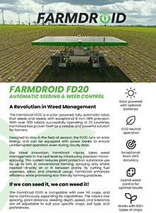 FarmDroid FD20 is a solar panel driven field robot that, by using a GPS signal, marks the placement of the crops at sowing and subsequently performs mechanical weed control both between and in the rows.